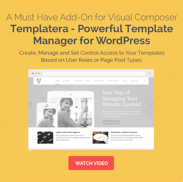 From creators of Visual Composer comes well-crafted native add-on for most beloved page builder of WordPress. Templatera allows you to create, manage and set control access to your templates based on user roles or page post types.