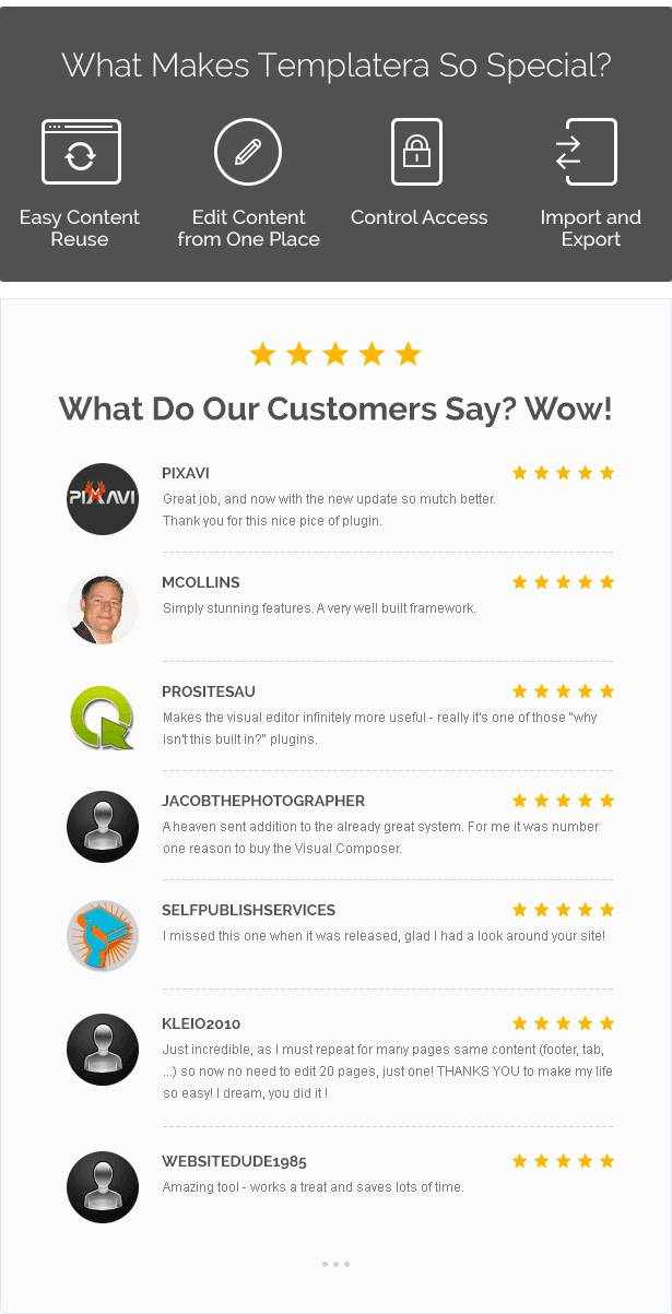 “Just to say that this is a fantastic addition to an already excellent plugin. This add-on has allowed me to now edit and save an individual VC content element (not the entire template which is different) that is repeated on many of my pages in one easy stroke, by simply creating a Templatera template. Before I had to edit the repeated VC element multiple times for each page. This was just what I needed.” – John