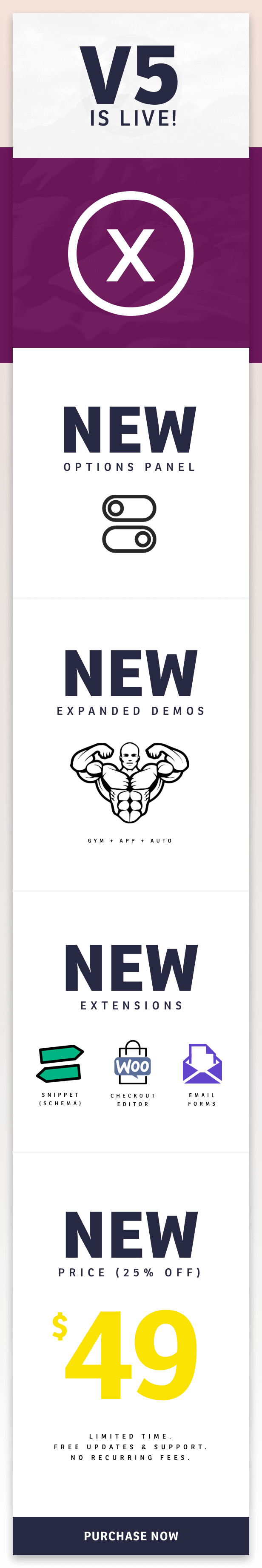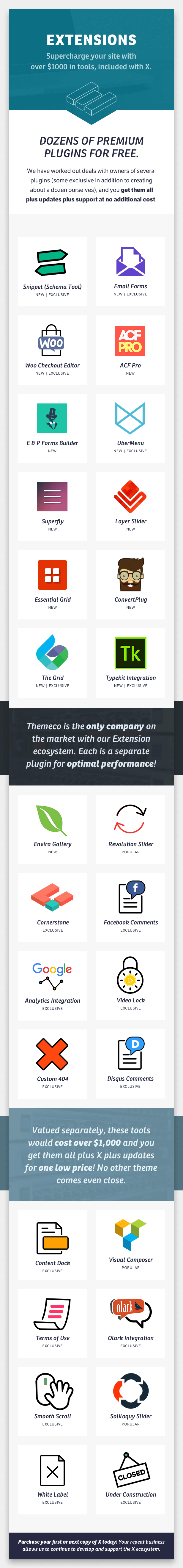 Extensions – Easily build upon the firm foundation X has already laid forth with our incredible new Extensions. Within the X ecosystem, Extensions are comprised of plugins built by our staff to work seamlessly with X, as well as third party plugins by developers we’ve partnered with to bring you great features that we’ve integrated tightly into the theme. This keeps X lean for those who might not need a certain feature and as efficient as possible for those who do! Be sure to check out a full list of our Extensions for more information on these amazing features that are included for free with each unique purchase as well as this FAQ explaining how the licensing works.