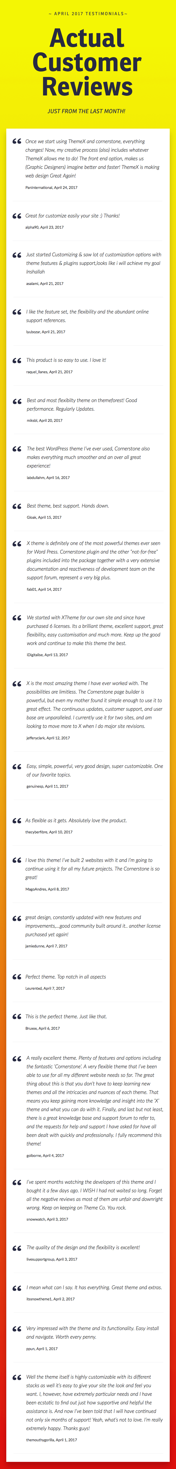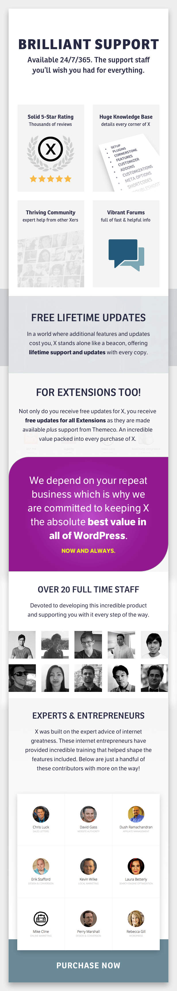 Experts – X was built upon the input of industry-leading experts. We consulted numerous individuals and asked them what sort of features they wanted to see in a theme from an SEO standpoint, design, feature-set, et cetera, and built their suggestions right into the theme. Forget the marketing speak, X truly delivers on what it promises.